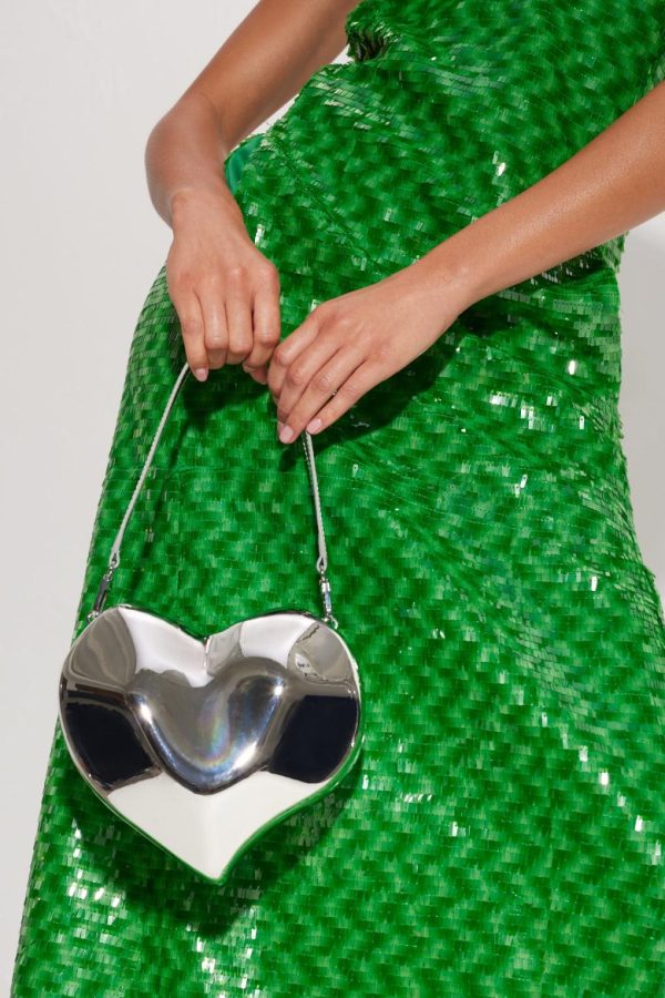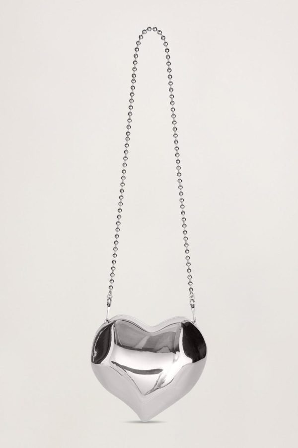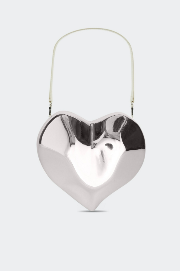 Abstract resin heart shaped bag with custom hardware. The vegan leather strap and chain strap are both detachable providing versatility. This statement piece blends artistry with functionality. Vegan leather lined.
