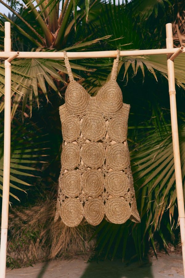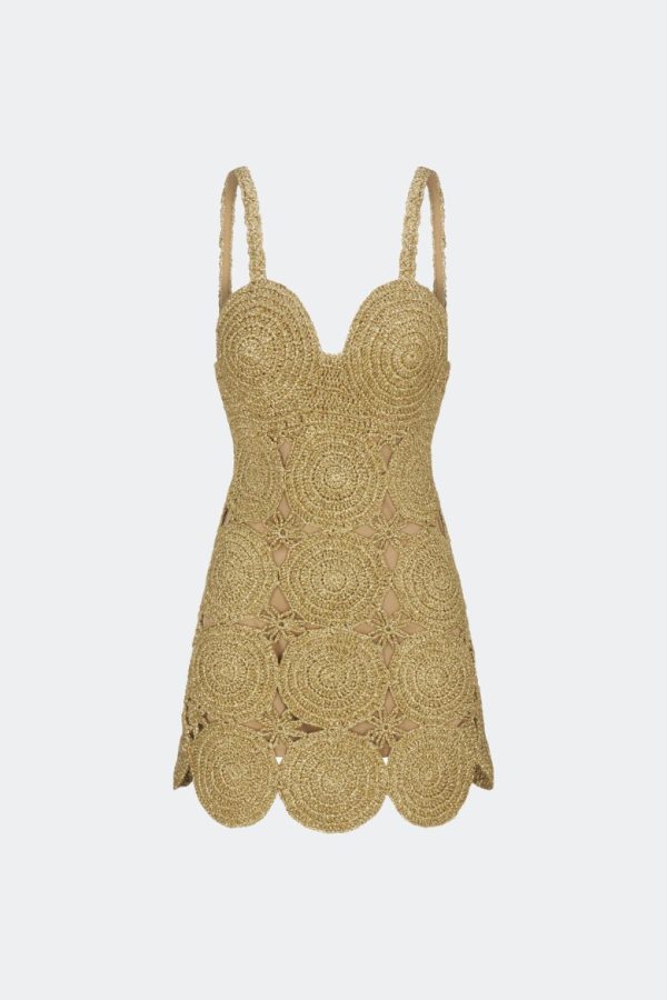 The iconic Beep Beep Dress now in a mini and a new color. Hand knit lurex crochet mini dress with circular cutout details. Self colored lining.