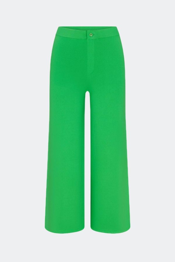 Relaxed wide-leg pants with elastic waist, zip closure, back pockets, and puffed hems. Matching Zaca Knit Mini Dress