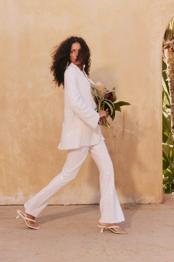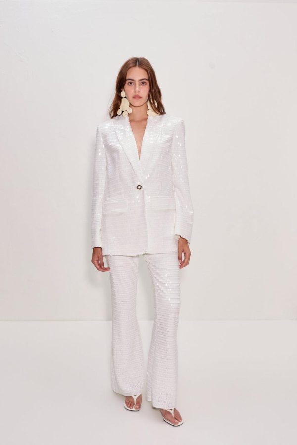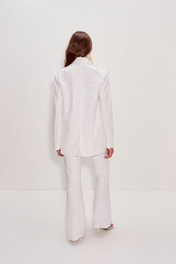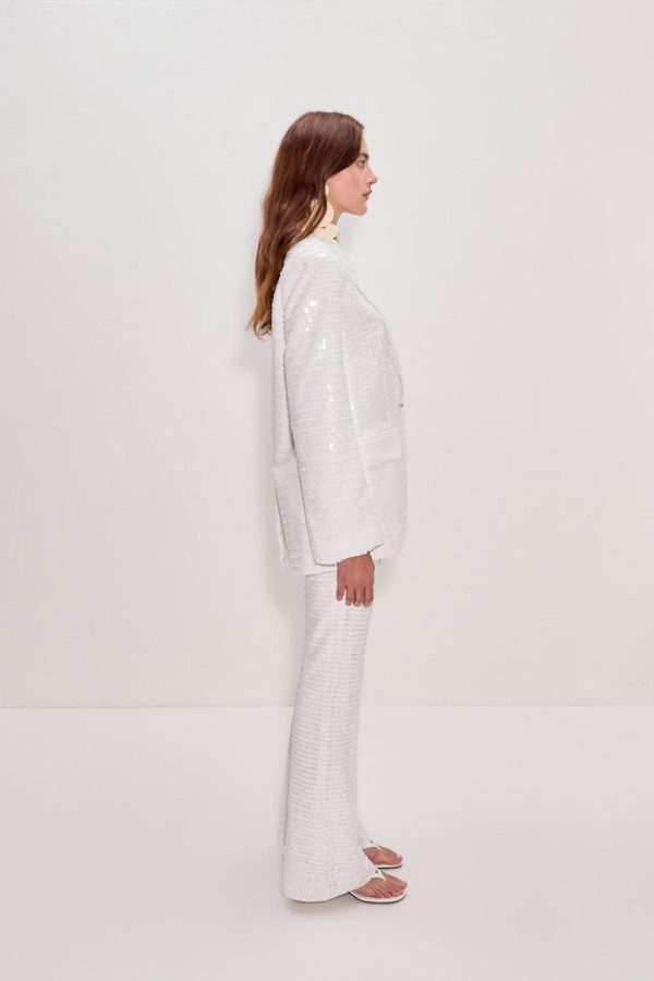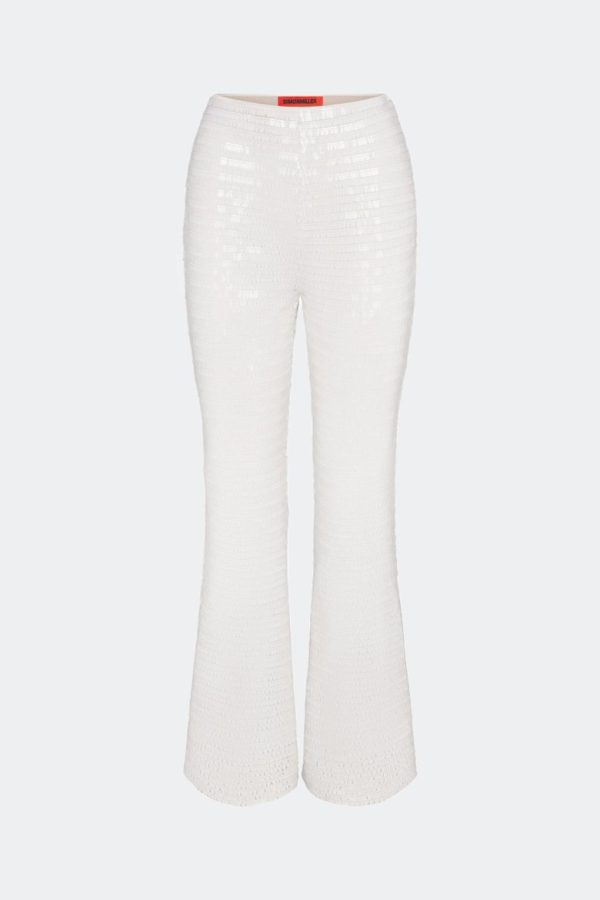 High-rise flared pant with with side zipper closure. Micro paillette rectangular sequin all over fabrication.