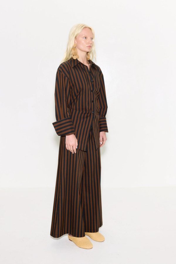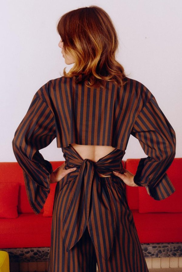 Stretch cotton poplin, with cut out back and adjustable tie for fit flexibility. The ultimate versatile piece, dress up or down NOW IN A NEW COLORED STRIPE.