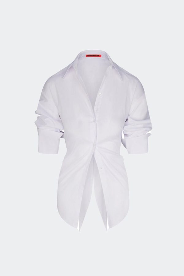 Stretch cotton poplin, with cut out back and adjustable tie for fit flexibility. The ultimate versatile piece, dress up or down.